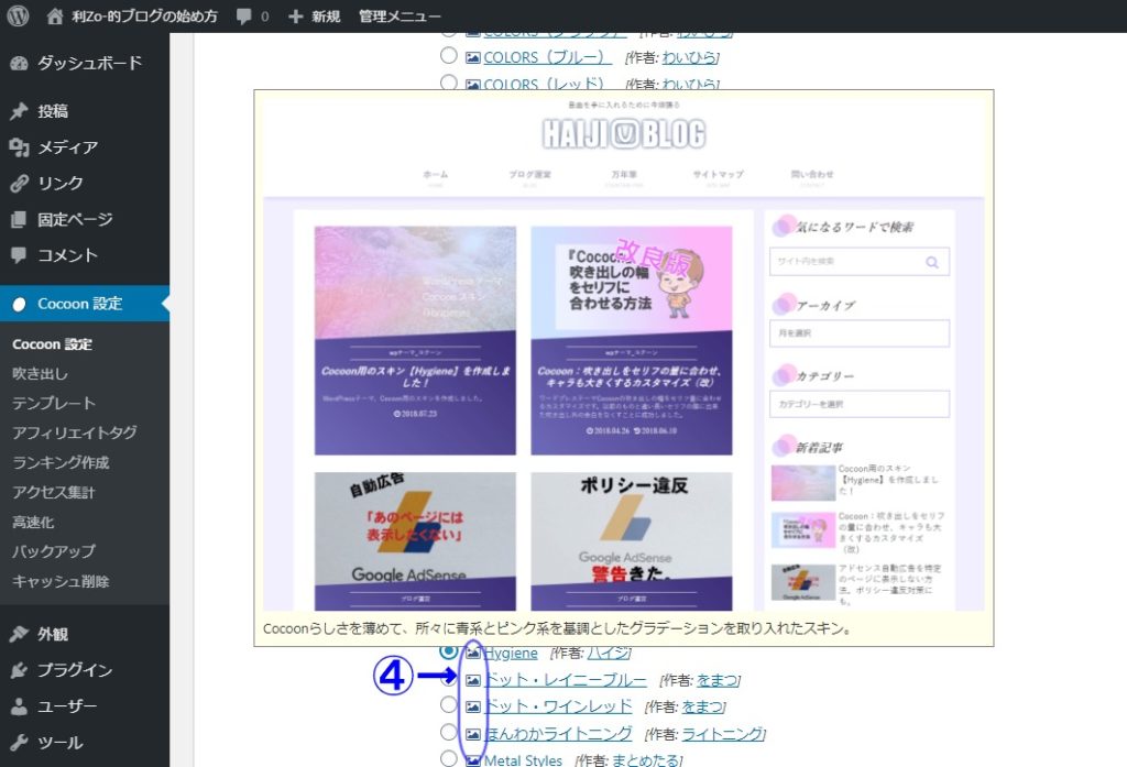 ④カーソルをスキンのイメージのアイコンに当てるとそのスキンで作ったサンプルのサイトが表示されます。