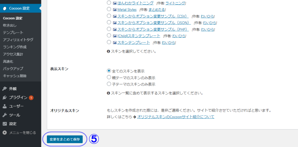 5・気に入ったスキンの〇にチェックを入れて選択したらさらに下にスクロールして行き⑤の「変更をまとめて保存」ボタンを押します。