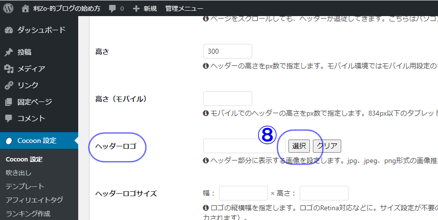 11・少し下にスクロールして⑧のヘッダーロゴという項目の「選択」ボタンを押します。