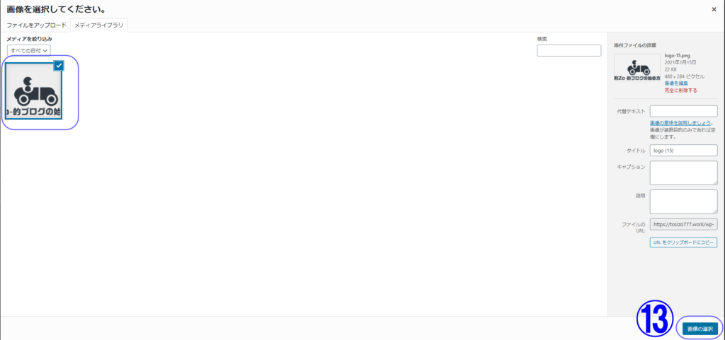 小さくて見ずらいですが右下⑬の「画像の選択」というボタンを押します。