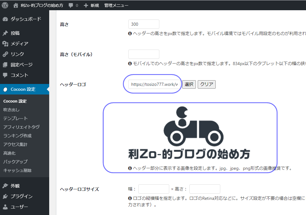 ヘッダーロゴの空白だった部分に画像のアドレスが表示され、下に画像が表示されます。