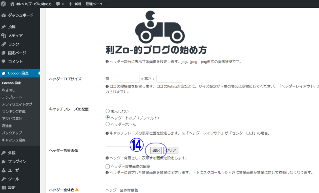 少し下にスクロールしてヘッダー背景画像という項目で⑭の「選択」ボタンを押します。