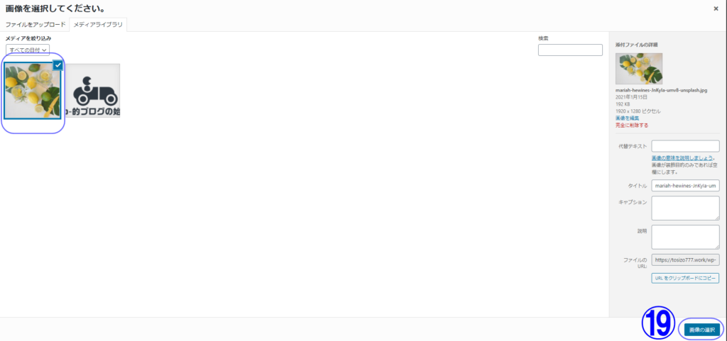 21・画面左上に選択したファイルが写真表示されたので⑲の「画像の選択」ボタンを押します。