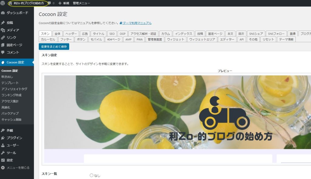 今回デモサイトはCocoonで設定しているのは3か所、スキンとヘッダーと言われる部分、あとはヘッダーに入っている自分のサイトのロゴのみになります。