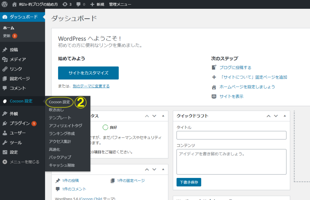 2・ダッシュボードに入ったら左のメニューの「Cocoon設定」という項目にカーソルを合わせると右側にメニューが表示されるのでその中の②「Cocoon設定」をクリック。