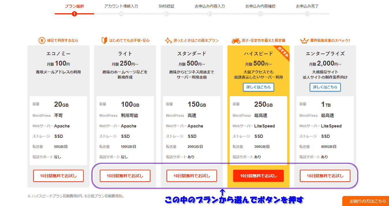 実際どのプランに対しても10日間の無料期間が適用されます。