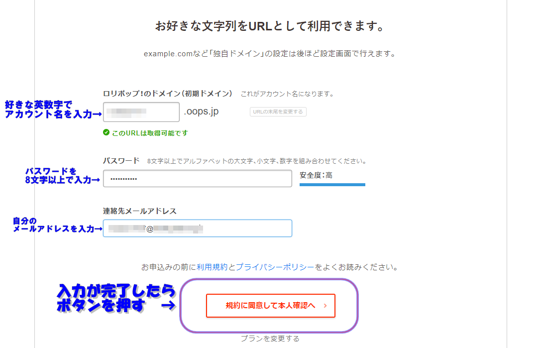 4・アカウント情報入力:ここで初期に使うロリポップから提供のドメインの名前を決めます。