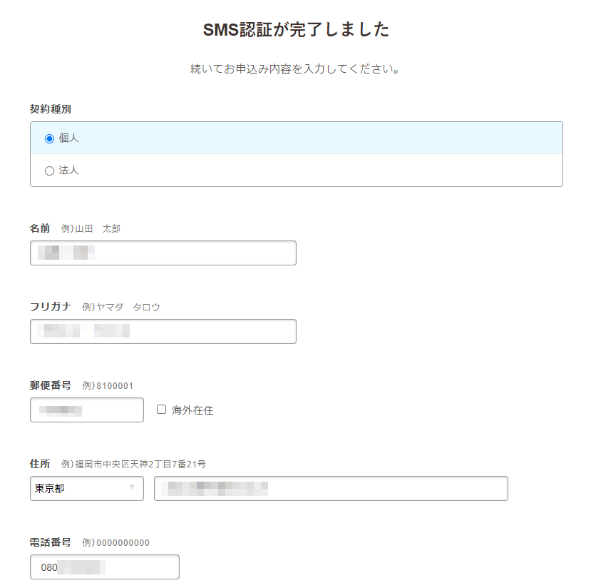 契約種別の個人にチェックを入れ各項目に入力していきます。