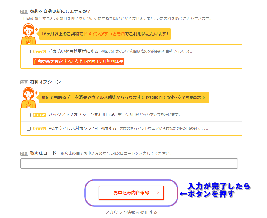入力し終わったら「お申し込み内容確認」ボタンを押します。