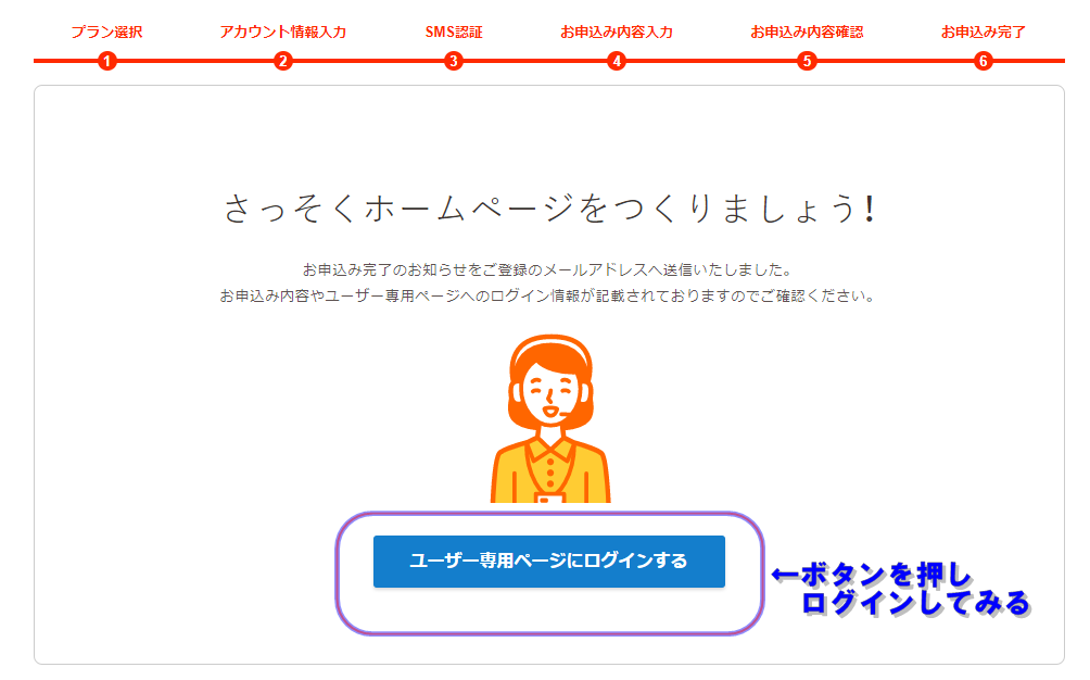 9・登録完了です。「ユーザー専用ページにログインする」ボタンを押してみましょう。