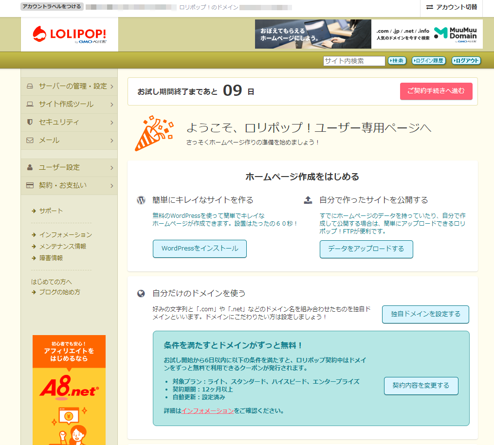 ☆10日間の無料期間があるのですが6日以内に自動更新で1年契約を済ませないと「ドメインずっと無料」のクーポンが貰えないので早めに契約を!