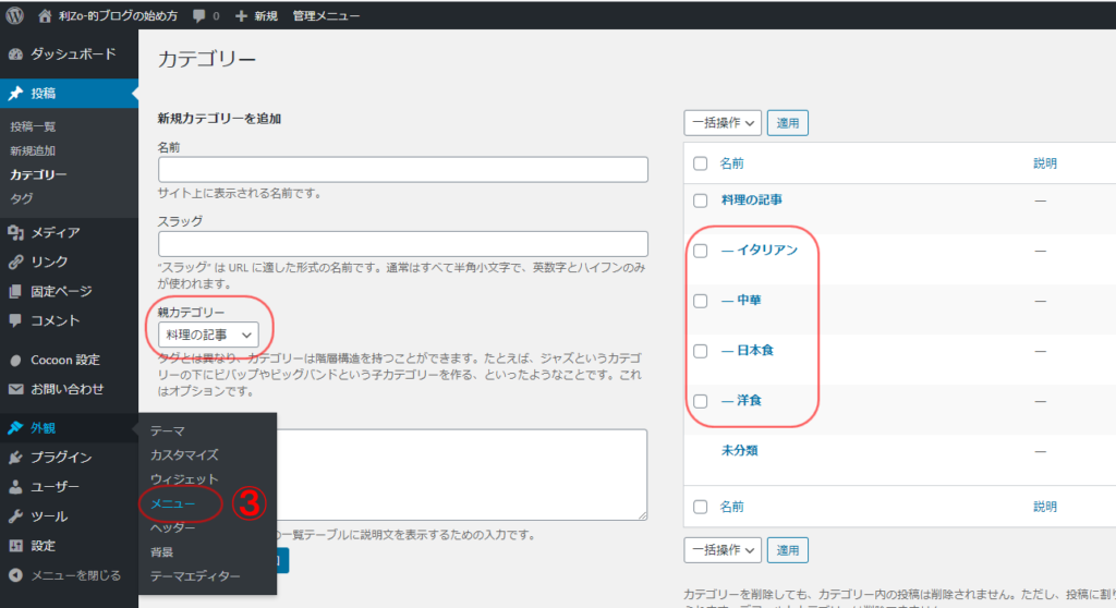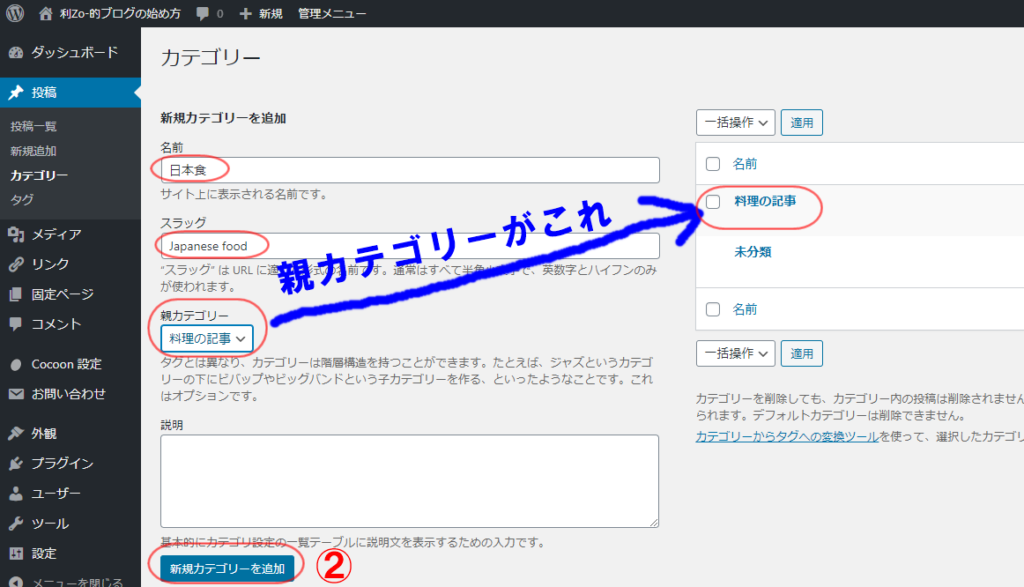 今回は「料理の記事」という親カテゴリーの下に子カテゴリーを設定してみます。