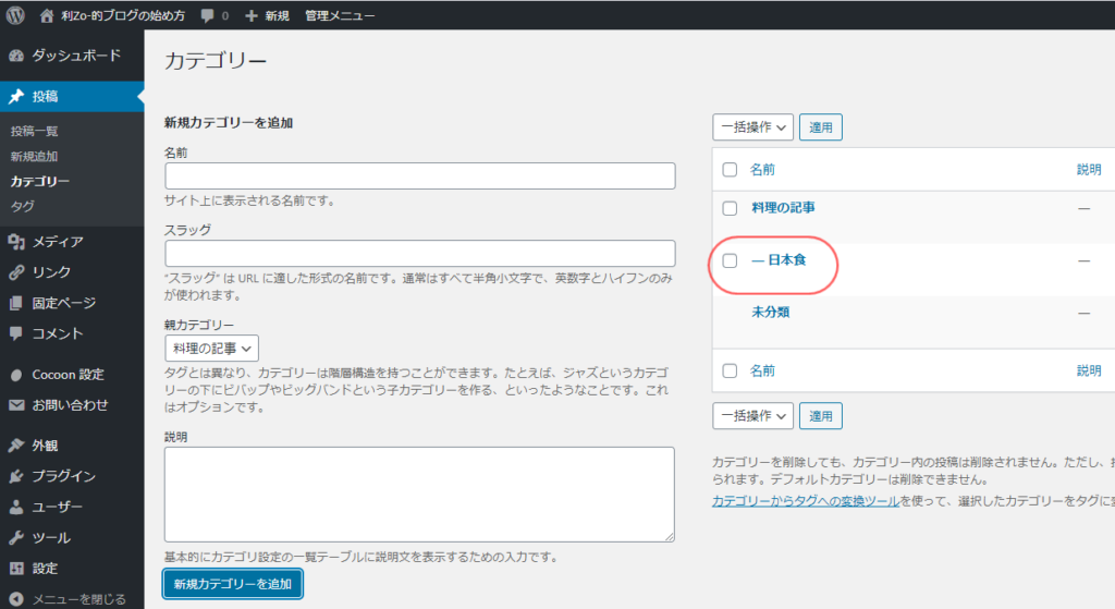 3・「料理の記事」という親カテゴリーの下に「ー日本食」というカテゴリーが追加されました。