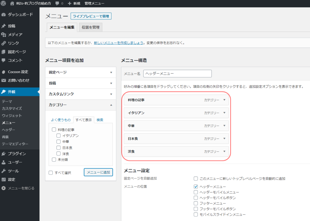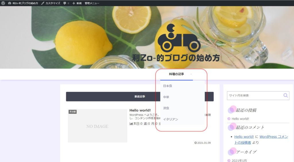 10・カーソルを「料理の記事」ボタンに持っていくとプルダウンメニューとして子カテゴリーに設定した「日本食」「中華」「洋食」「イタリアン」が表示されます。