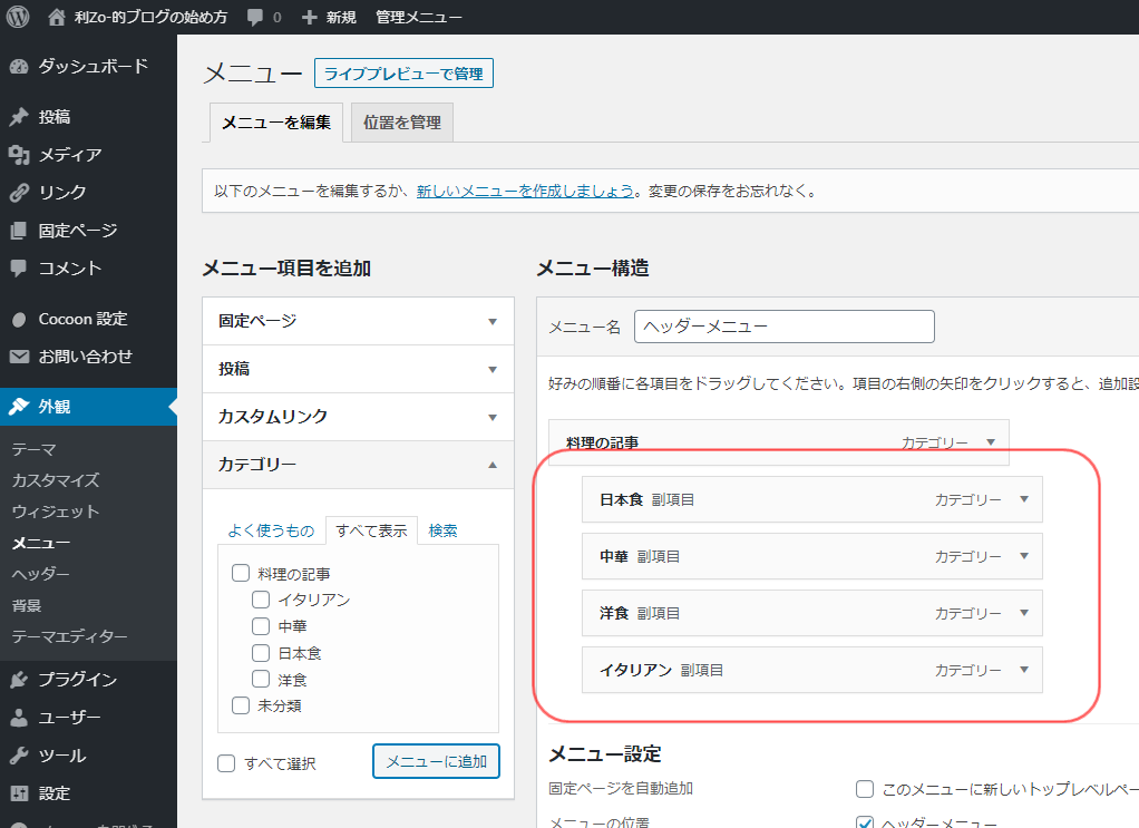 このようにすると親カテゴリー「料理の記事」の下に子カテゴリー「日本食」「中華」「洋食」「イタリアン」が入る形になり「副項目」と表示される。