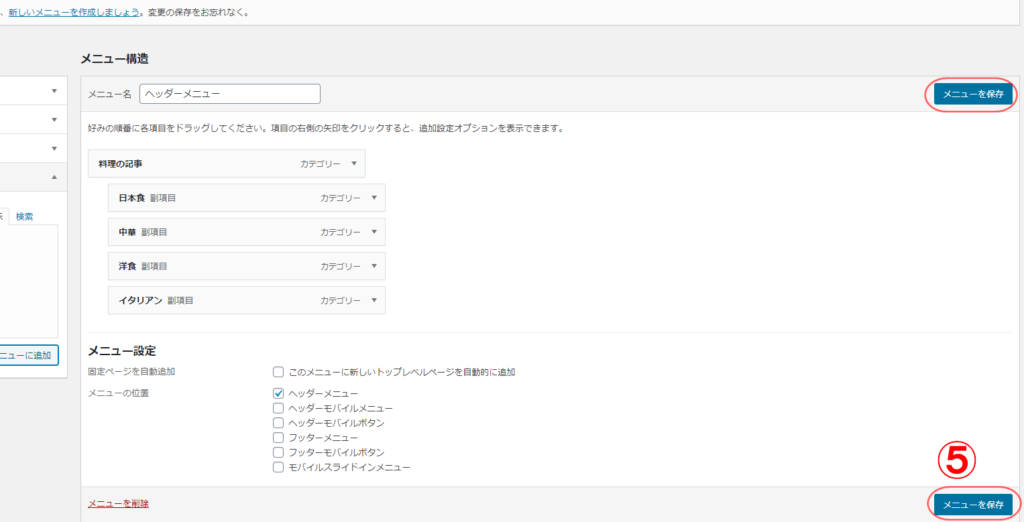 • 追加した子カテゴリー全てをドラッグ&ドロップで少し右にずらし副項目として設定を保存する