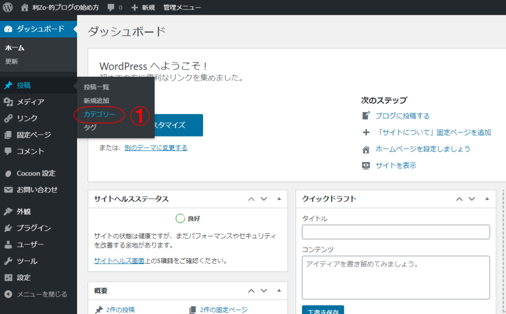 1・左のメニューの投稿にカーソルを持っていくと右に項目が表示されるので①カテゴリーをクリックします。