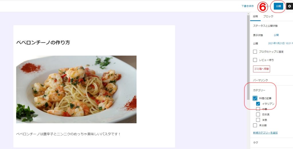この記事の場合は子カテゴリーの「イタリアン」というカテゴリーにチェックを入れれば階層的に上の「料理の記事」という親カテゴリーにも紐づけされます。