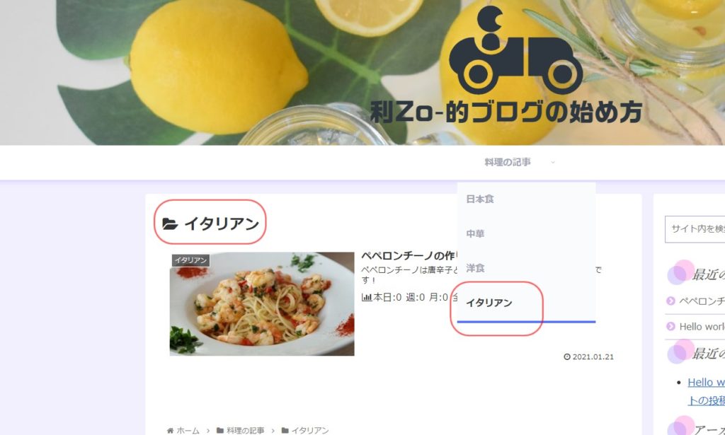 12・サイトのトップページに行き「料理の記事」→「イタリアン」をクリックすると「イタリアン」というカテゴリーのページの中に先程の記事が表示されます。