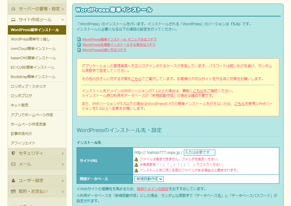 - パスワード:WordPressにログインする時のパスワード(忘れないように控える)