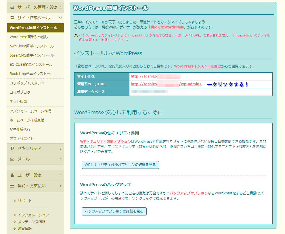 ここに表示されている「サイトURL」と「管理者ページURL」は控えておいてください。