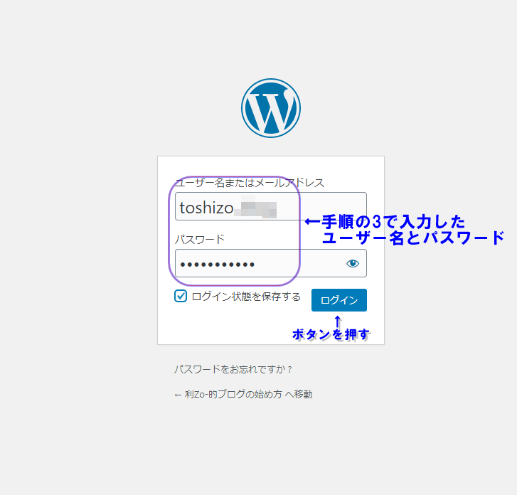 この記事の手順の3で入力したWordPressの設定用のユーザー名とパスワードを入力