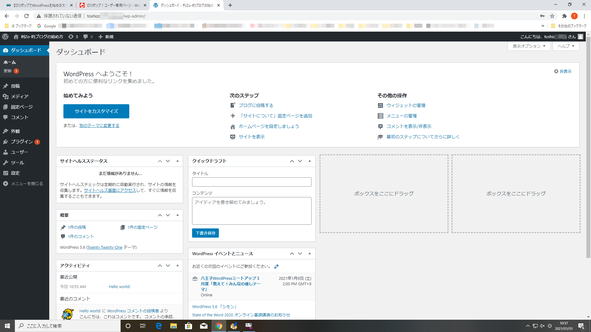 今ご覧の画面はWordPressの全体の設定項目にアクセスする「ダッシュボード」というメニュー画面です。