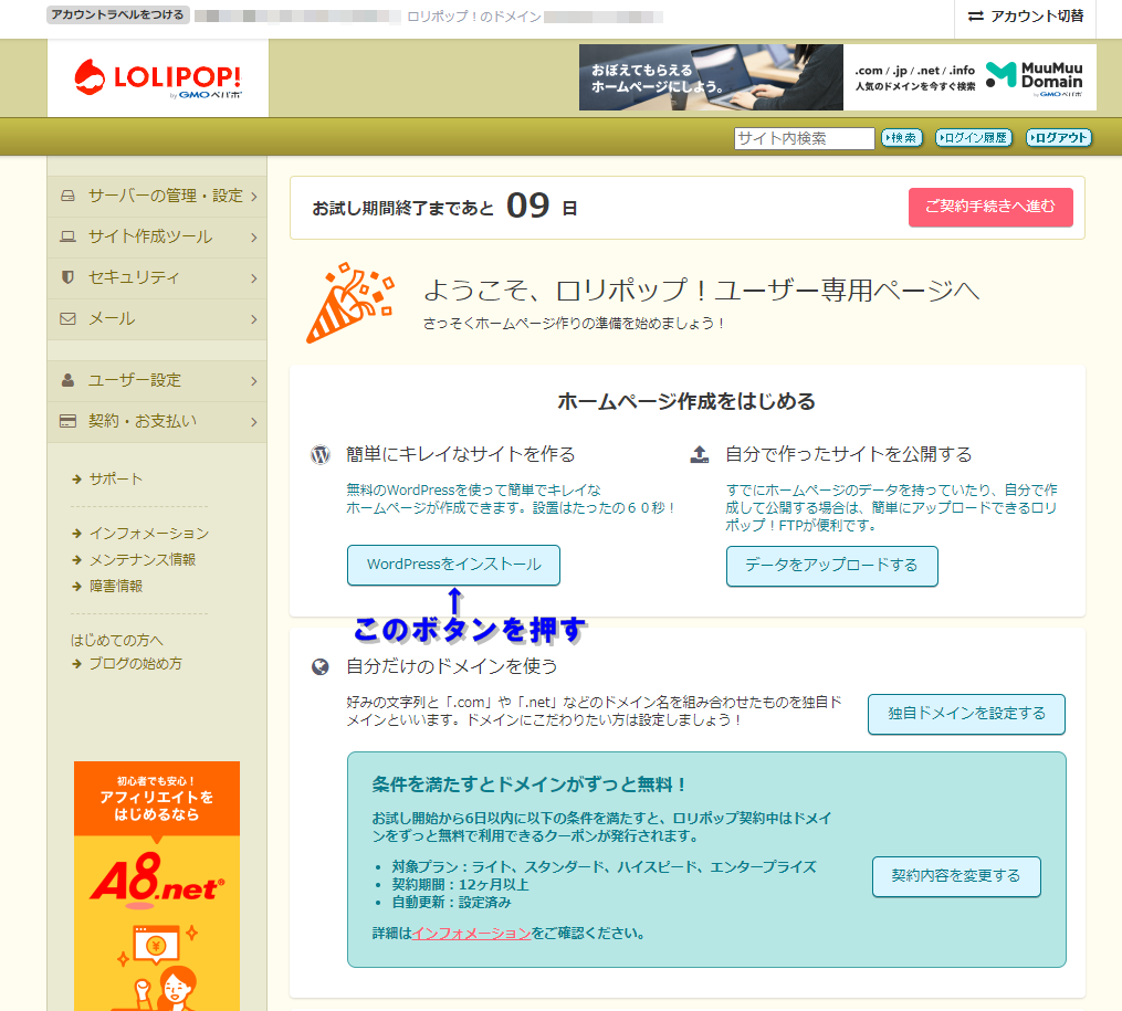 ロリポップ・レンタルサーバーでの「WordPress簡単インストール」の手順です。