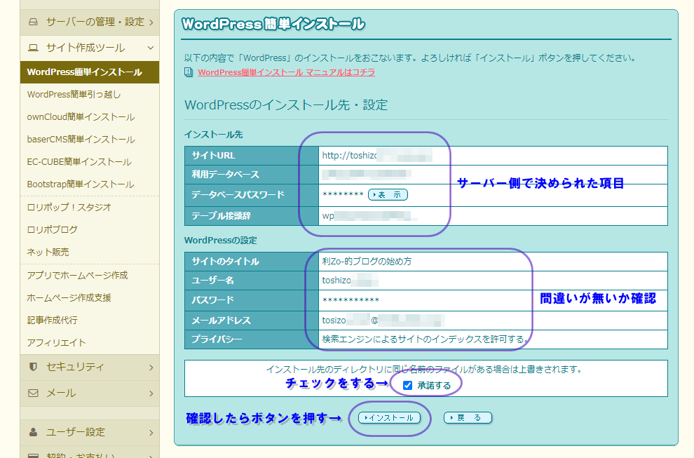 4・入力した項目の確認画面が表示されいよいよWordPressのインストール!
